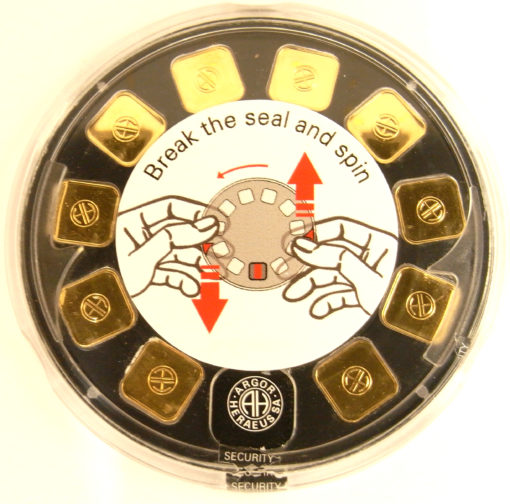 Le coffret Argor-Heraeus Goldseed se présente sous la forme d'une boîte ronde en plastique,